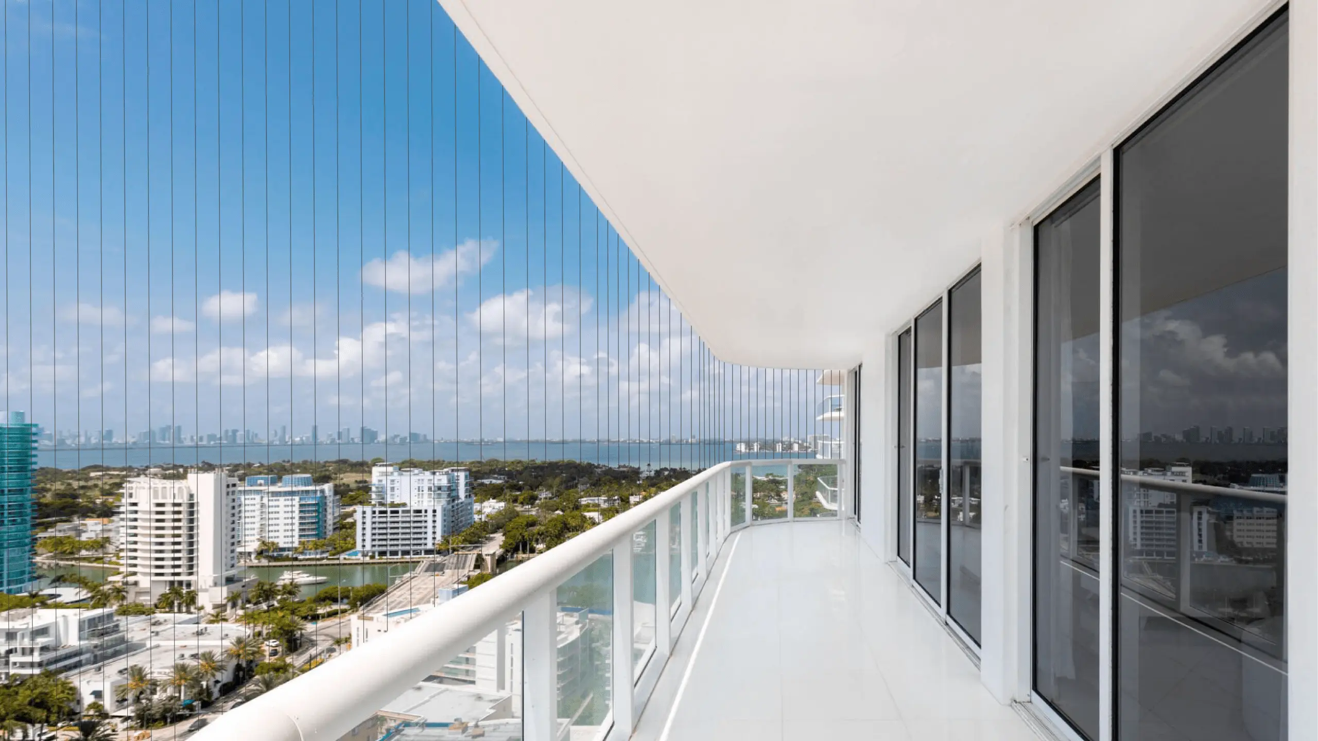 Invisible safety grills for balconies use high-tensile stainless-steel wires supported by sturdy aluminium tracks to provide strong protection without blocking the view.
